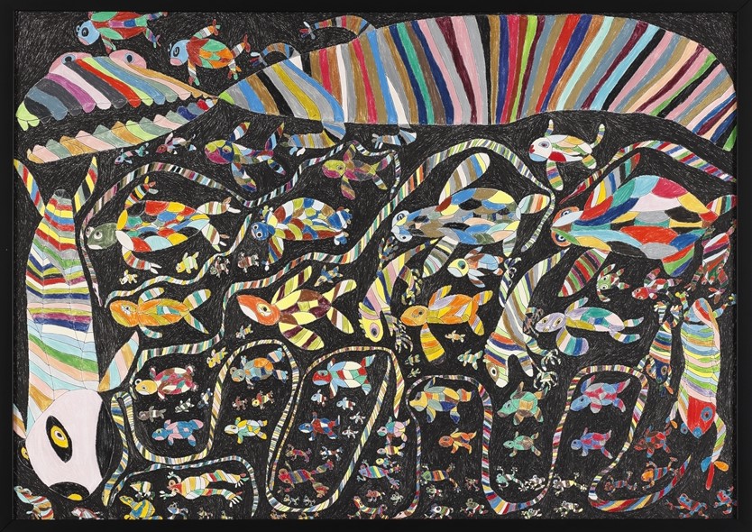 - 人物や動物などがペンを使って紙面いっぱいに描きこまれている。モチーフが決まると、紙面すべてに余白を余すことなく、ゆっくりとペンで描きこむ。動物図鑑などを見て自由に描いていると、このような個性的な絵が生まれてくるのだという。線のひとつひとつが...