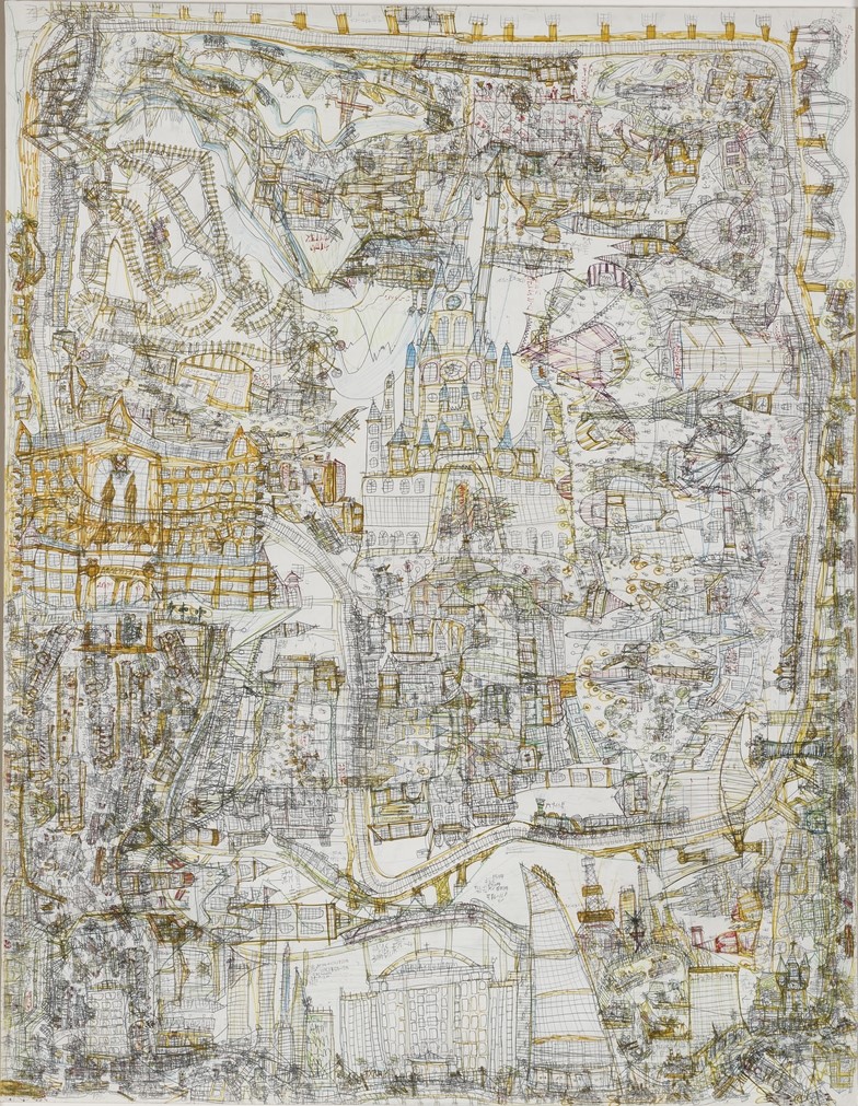 - スーパーやコンビニ、外食チェーンやランドマークタワーが混在する架空の世界が描かれている。上下左右から描かれたこれらの作品は、電車、建築物、宇宙、車、船など、古久保が興味のあるものと、テレビのニュースなどで得た情報とが組み合わされている。幼い...
